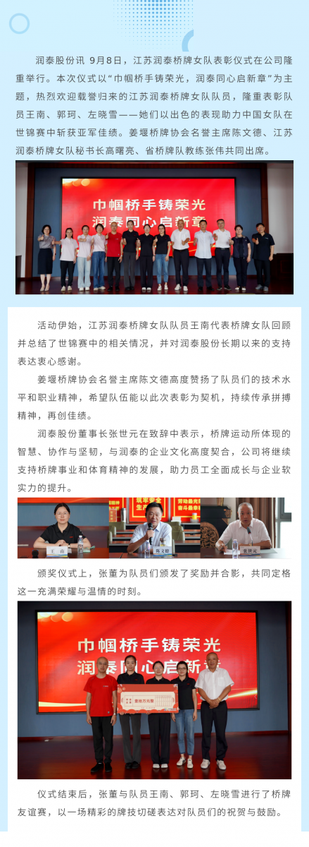 世锦赛亚军“回家”,润泰隆重表彰